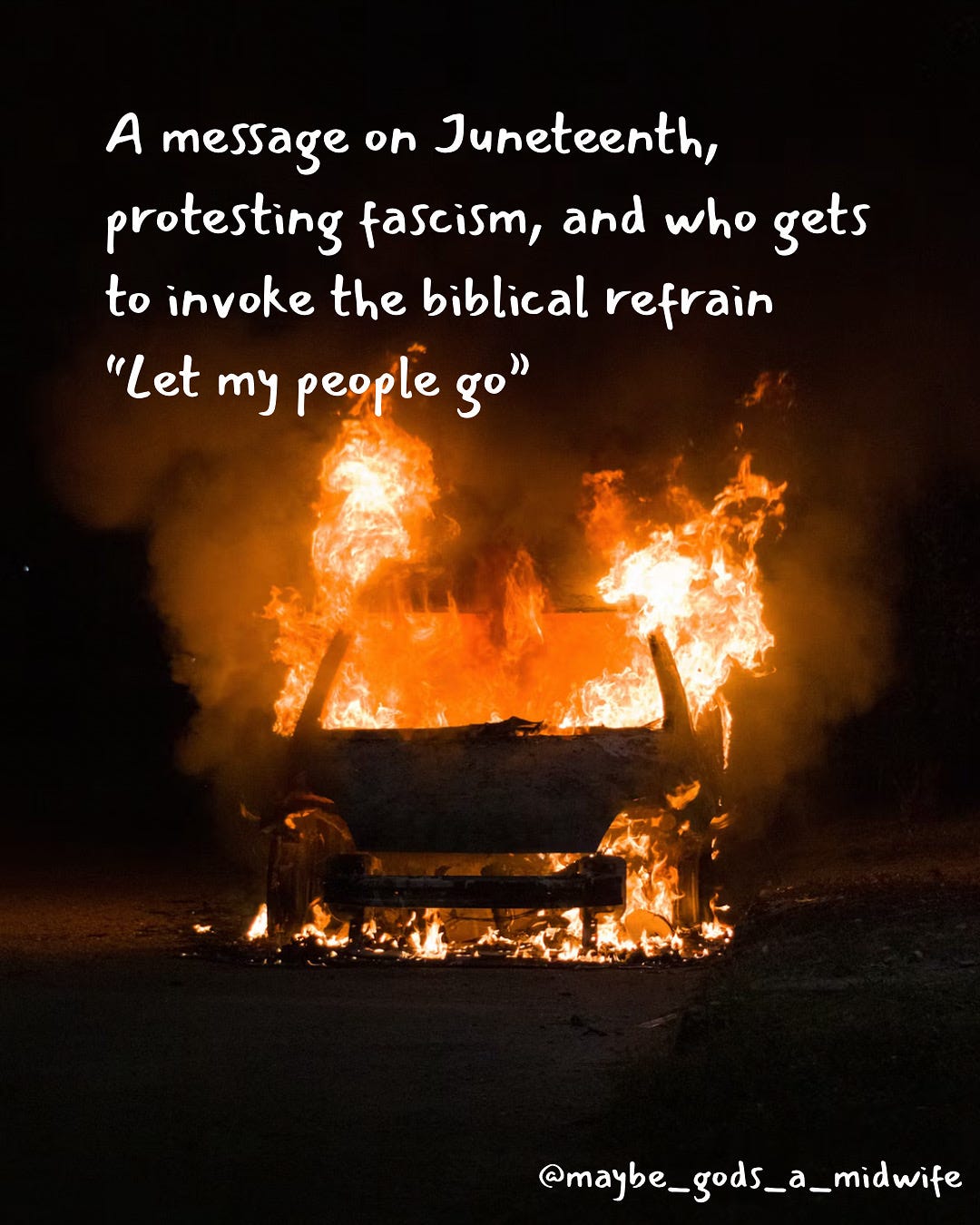 How can white evangelical Christians declare the importance of the exodus but downplay or reject Juneteenth? How can they assert that the exodus absolutely happened the way the Bible says it did, & that God was totally justified in taking batshit extreme measures to save his people from their oppressor, & then in their next breath criticize Americans for taking FAR LESS extreme measures to save themselves from *their* oppressor?